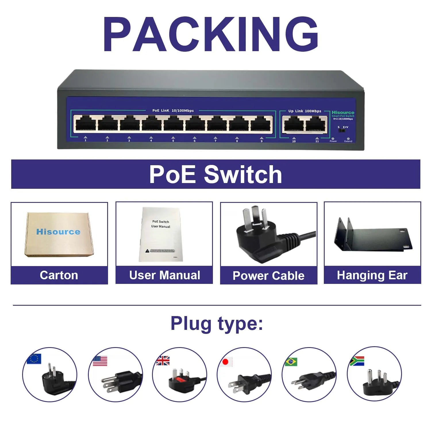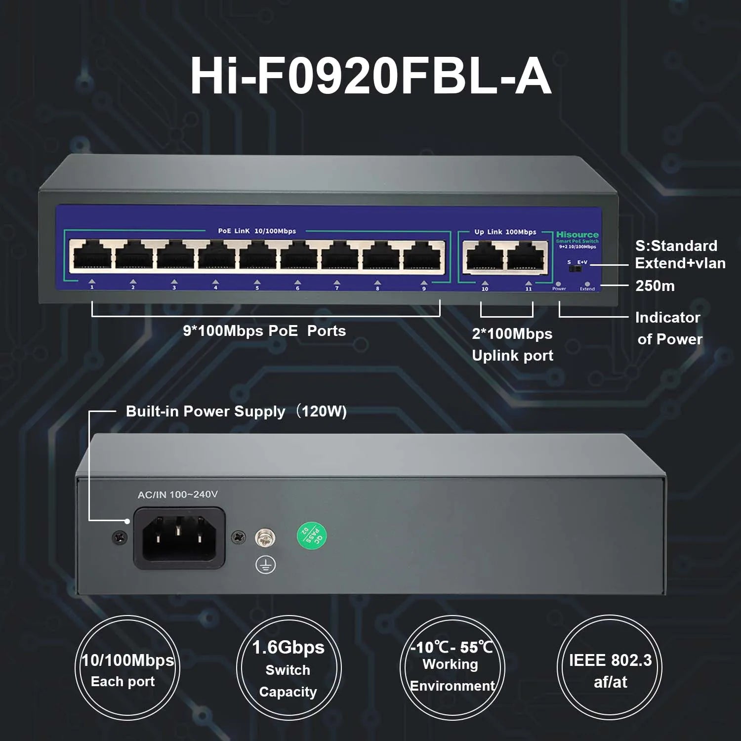 Switch PoE Fast Ethernet de 10 portas com alta potência de 120W. Padrão IEEE 802.3af/at, velocidade 10/100Mbps, até 30W por porta. Suporte VLAN e proteção contra raios 4KV. Ideal para câmeras IP, sistemas de segurança e dispositivos PoE em ambientes externos.