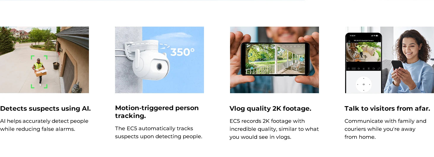 A EC5 Floodlight é única ao combinar câmera de segurança 2K com holofote potente de 400 lumens em um só dispositivo. Com rotação 360° PTZ, visão noturna colorida com alcance de 30 metros, rastreamento humano inteligente, sistema de dissuasão automática e conexão dupla (WiFi + LAN), você tem iluminação externa e segurança profissional em um único produto. Ideal para substituir holofotes comuns por uma solução inteligente completa.