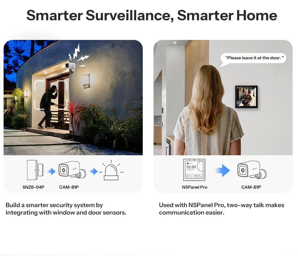 Proteja sua casa ou empresa com a câmera externa inteligente SONOFF CAM-B1P. Com resolução 2K HD, detecção humana por IA e visão noturna colorida, você terá monitoramento profissional 24 horas por dia.