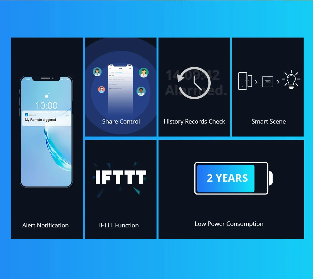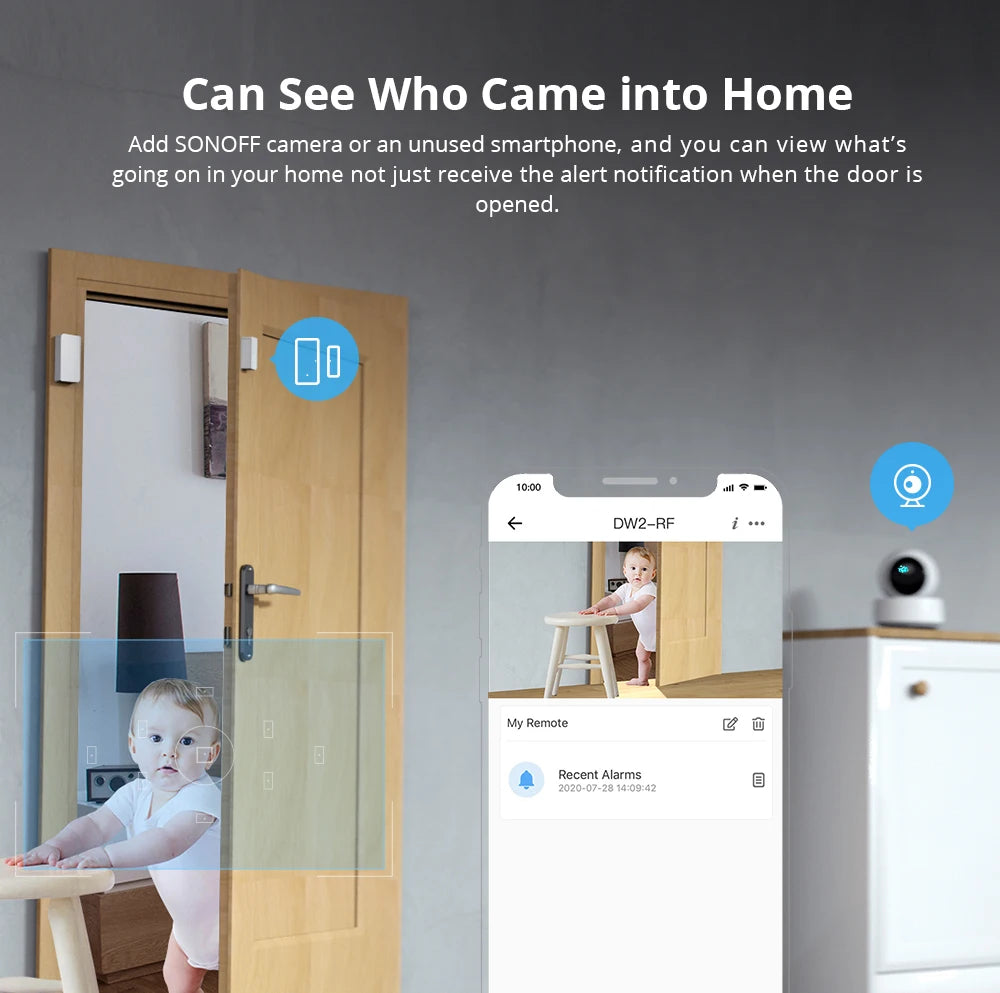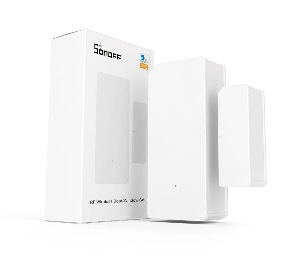O sensor é composto por duas peças: o sensor principal (com bateria) e o ímã. Quando instalados em porta ou janela, o sensor detecta a separação entre as peças e envia um sinal RF 433MHz para a ponte SONOFF RF, que pode acionar automações, enviar notificações ou ativar outros dispositivos.