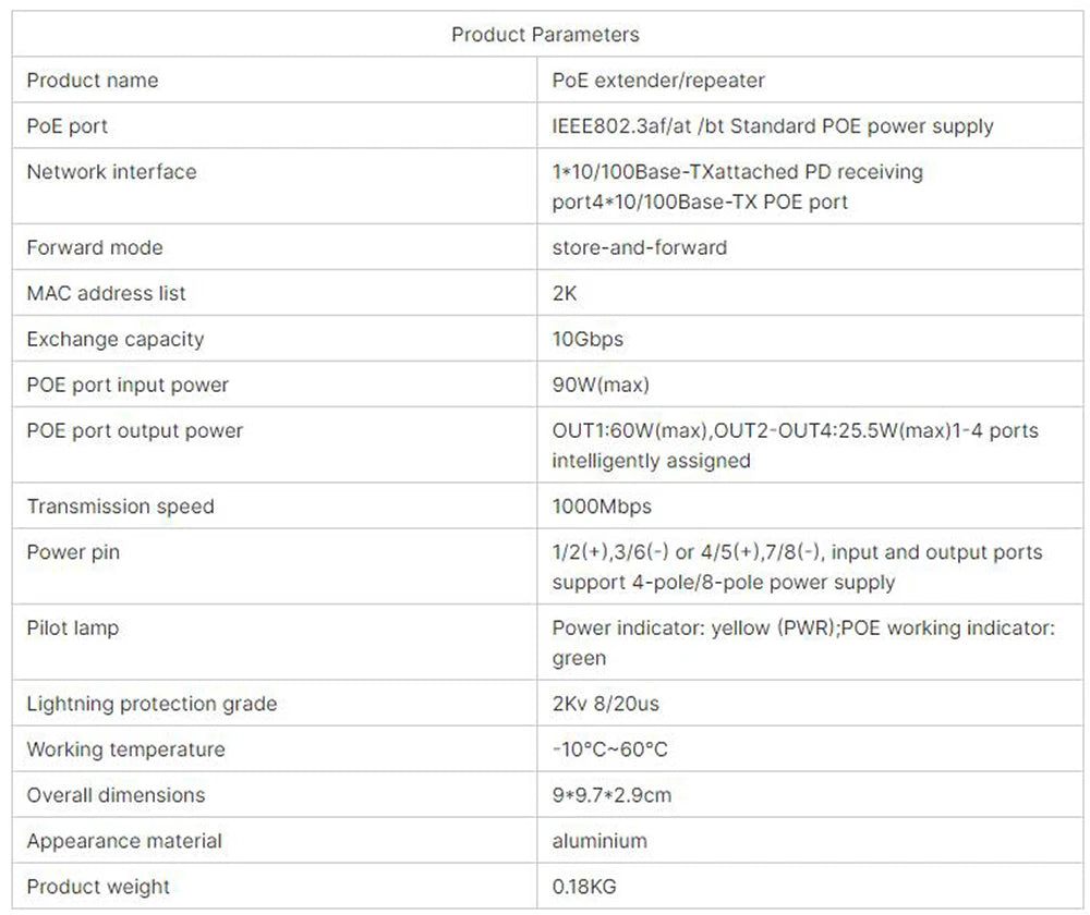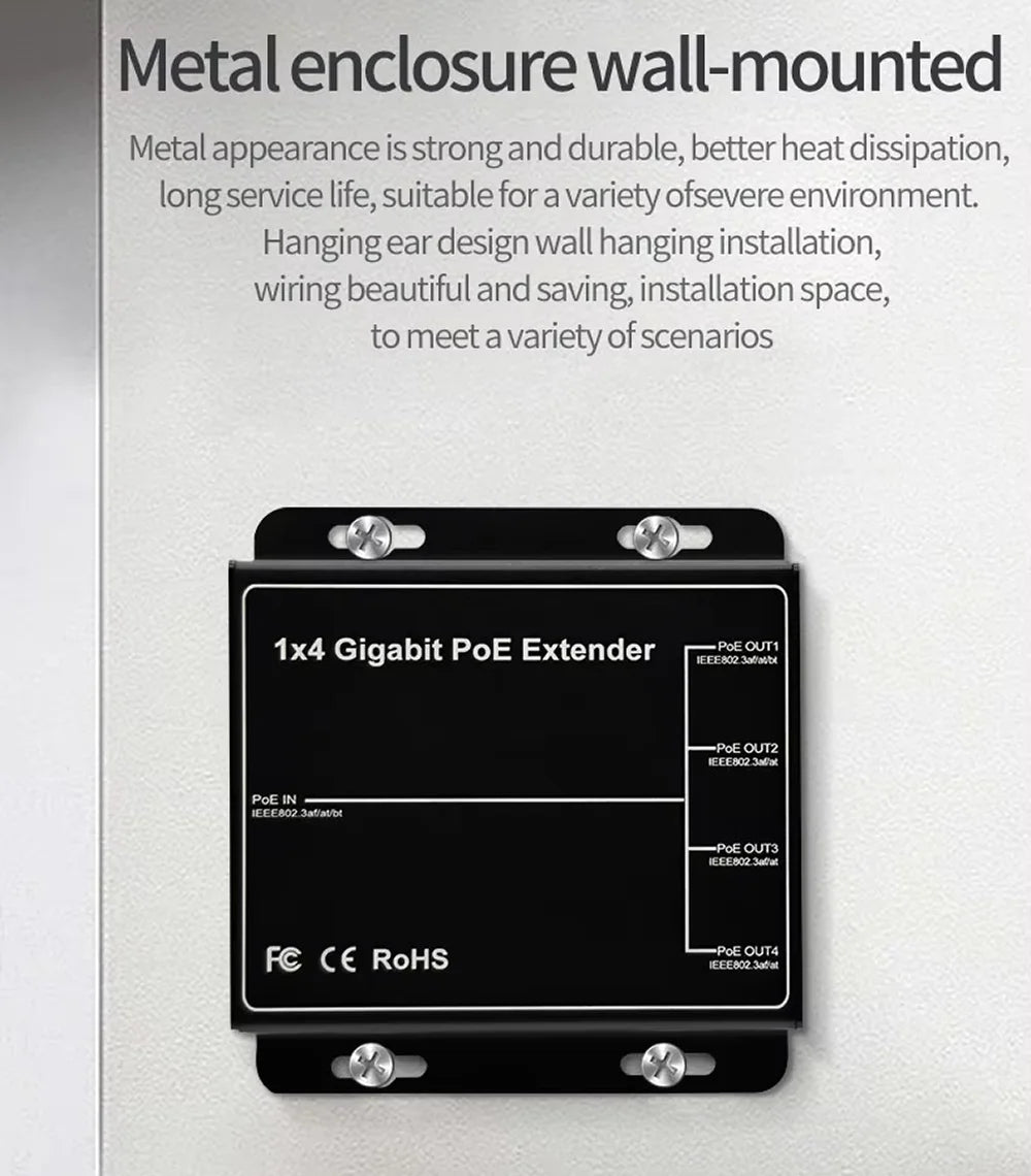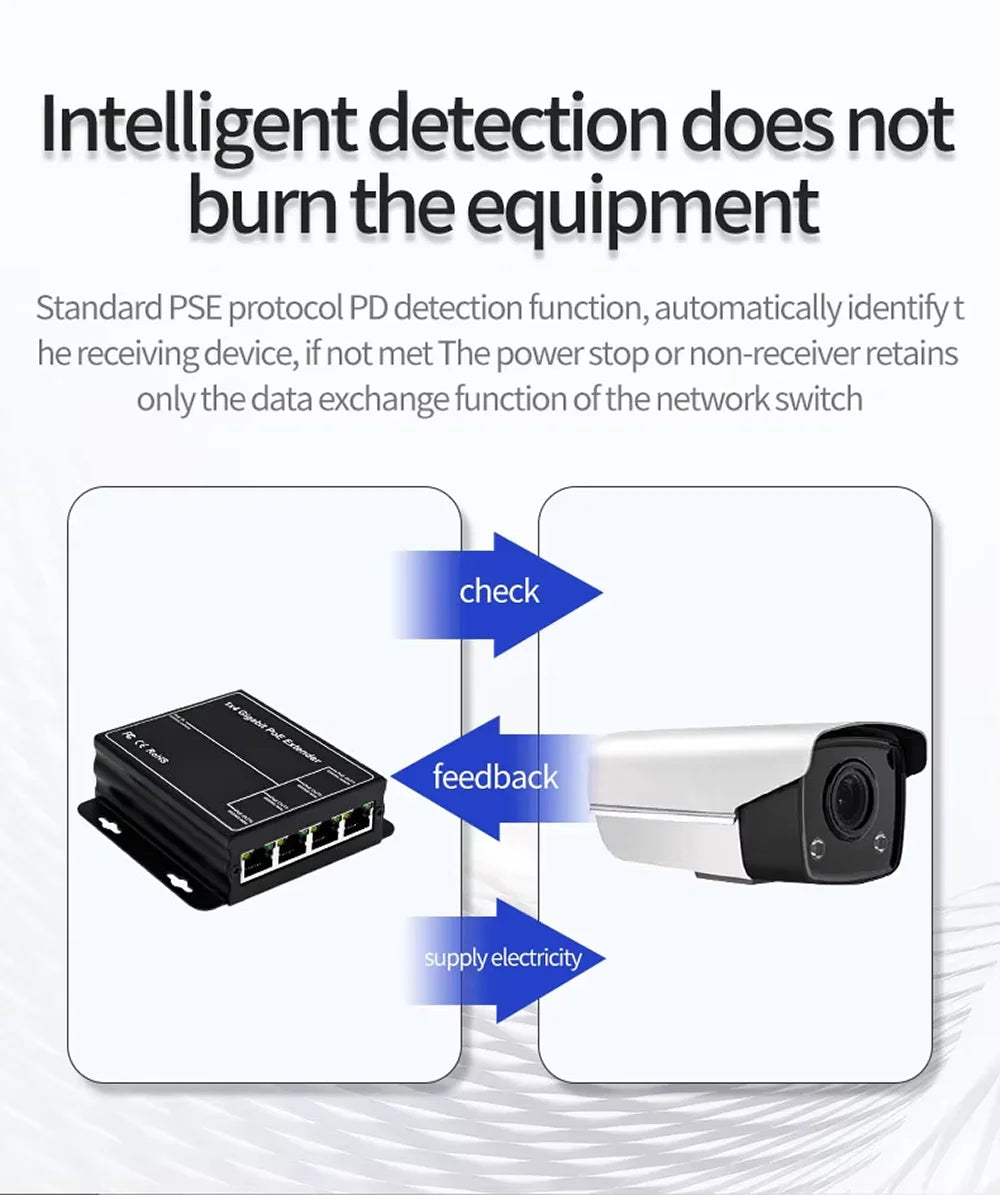 Extensor e repetidor PoE Gigabit HSmartcam com 4 portas e 90W de potência total. Padrão IEEE 802.3af, velocidade 100/1000Mbps, plug & play. Extensão de 100 metros. Ideal para câmeras IP, NVR e redes de alto desempenho.